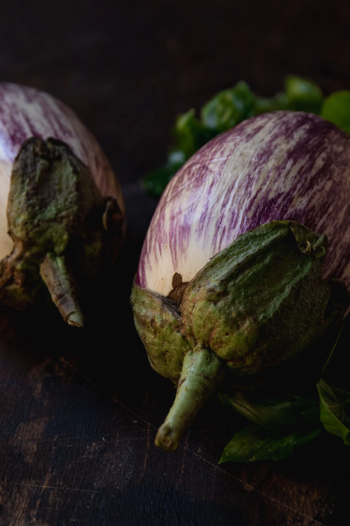 I couldn't resist these baby striped eggplants, but purple work just as well! If you are a using large eggplant and prefer a less chewy skin, peel long stripes down the side, this way the rounds hold their shape while still being tender.