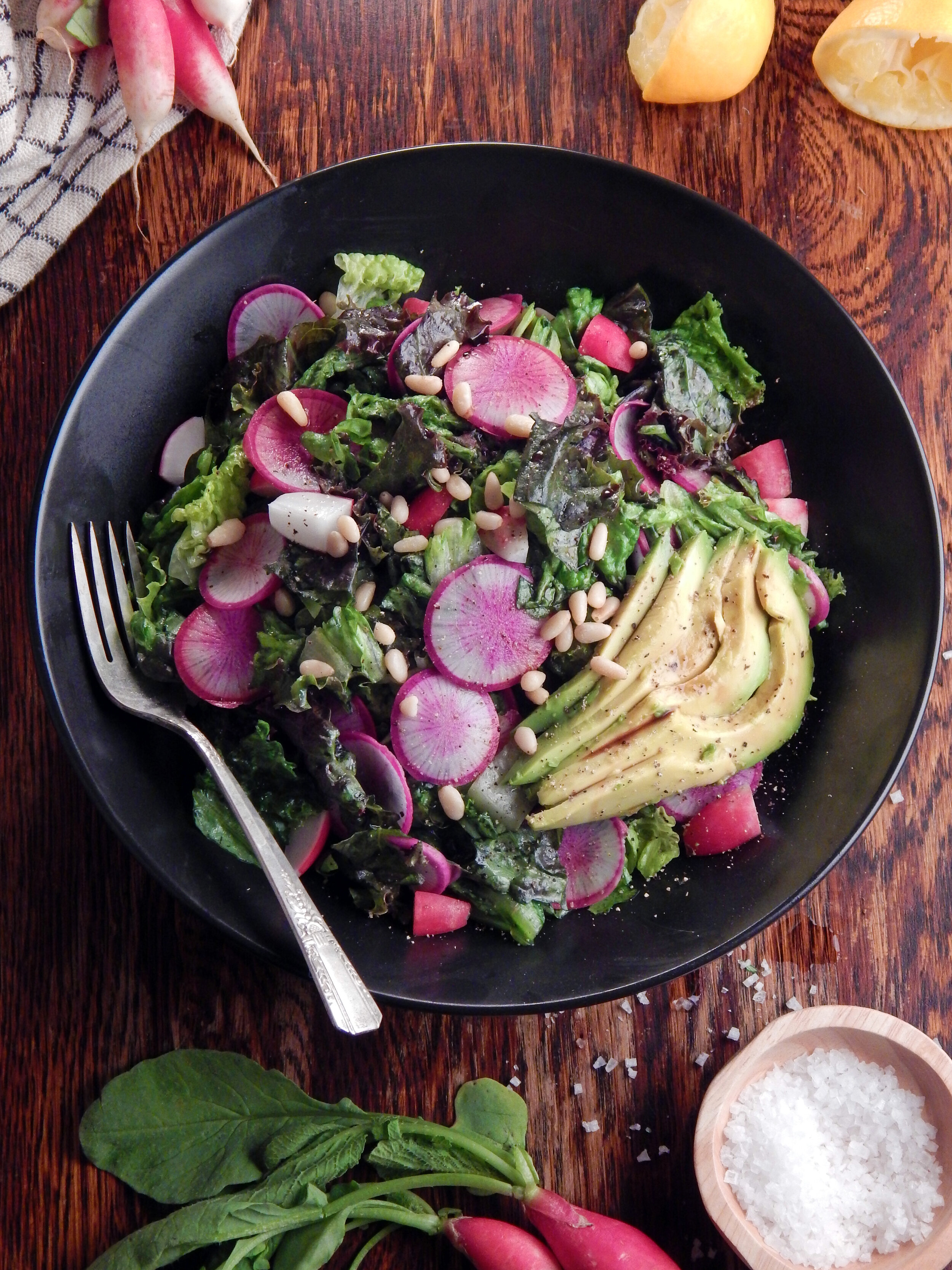 Before we jump into the season of hearty, autumnal comfort food, I wanted to share one last recipe inspired by the summer farmers’ market. This Radish, Avocado + Pine Nut Salad is inspired by one farmers’ market stand, with a table dedicated to vibrant, multicolored radishes. I knew I could think of something bright and fresh to showcase these beauties, and grabbed two bunches of french breakfast and purple radishes. Along with curly lettuce, sliced avocado, and toasted pine nuts, this salad is sweet, peppery, and a lil ode to the end of summer.
